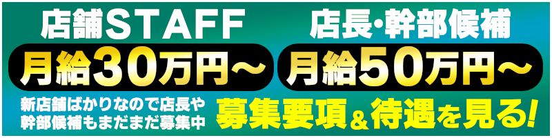| その他 | 研修スタッフ→店舗スタッフ→店長→統括→FCオーナー を最短1年で実現 個室寮あり ノルマ・ペナルティ一切なし 年1回、研修旅行あり(参加自由) |